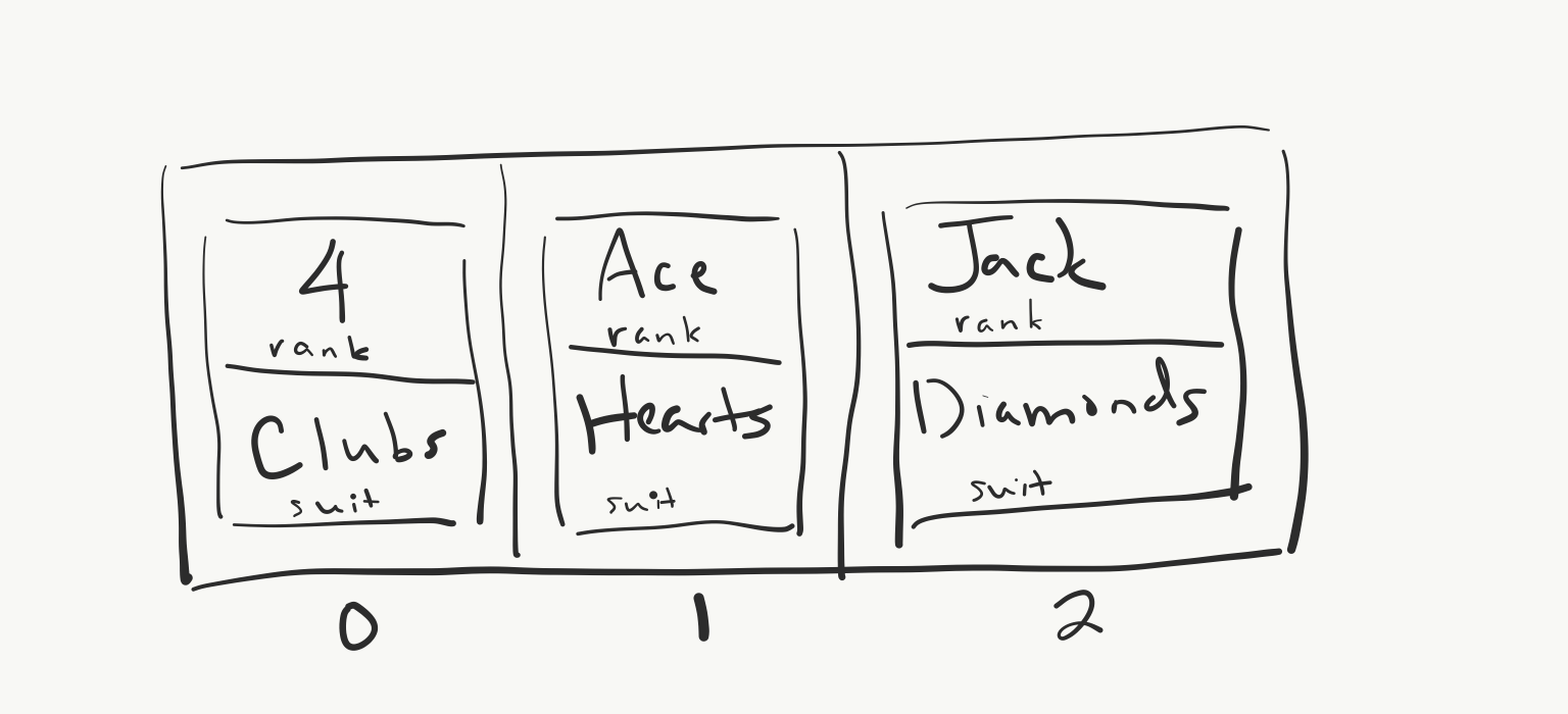 Now that we have a model for a playing card, how do we model a deck of cards? Java offers arrays, which are collections of a given type, where each element in the collection is numbered consecutively. You can make an array of any type. Figure An int array shows a picture of an int array: