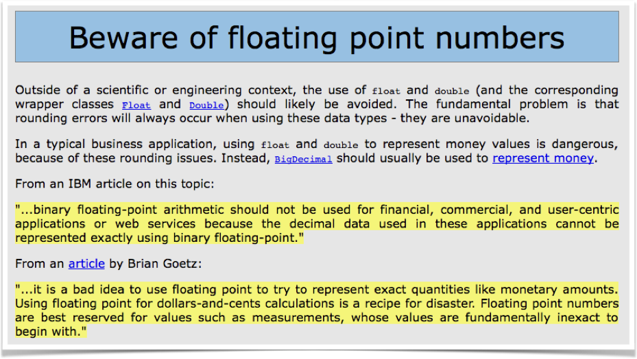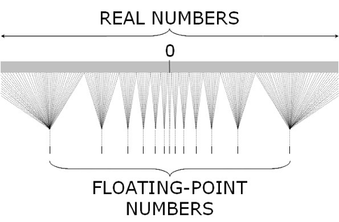Because float and double have a finite number of bits, not every value in the range above is representable. See Figure Floating-point representation is finite for an illustration of this. It shows that values of floating-point types can represent only a finite number of real values. As a result, some caution in where to use floating-point types is warranted. Figure Advice on appropriate use of floating-point types. shows some advice from javapractices.com:†