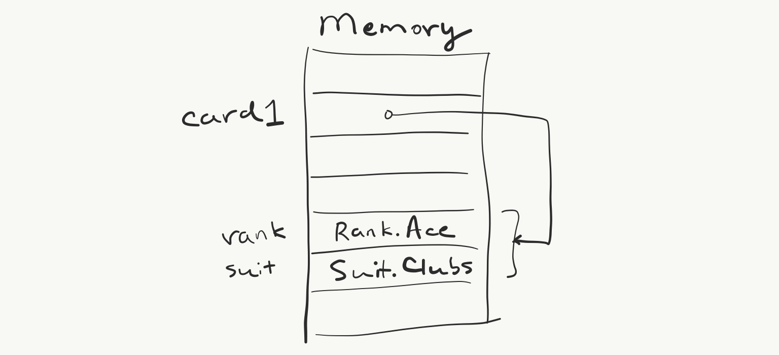The arrow from card1 to the instance of the Card class is the reference. If we had a memory scope, we would see the address of the Card instance in the memory location for card1—just some some number between 0 and however many bytes your computer's memory has. So the technically correct answer to the question “What's the value of card1?” is “the address of the Card instance it refers to.” But this is understood, so the most informative answer is “Ace of Clubs.”